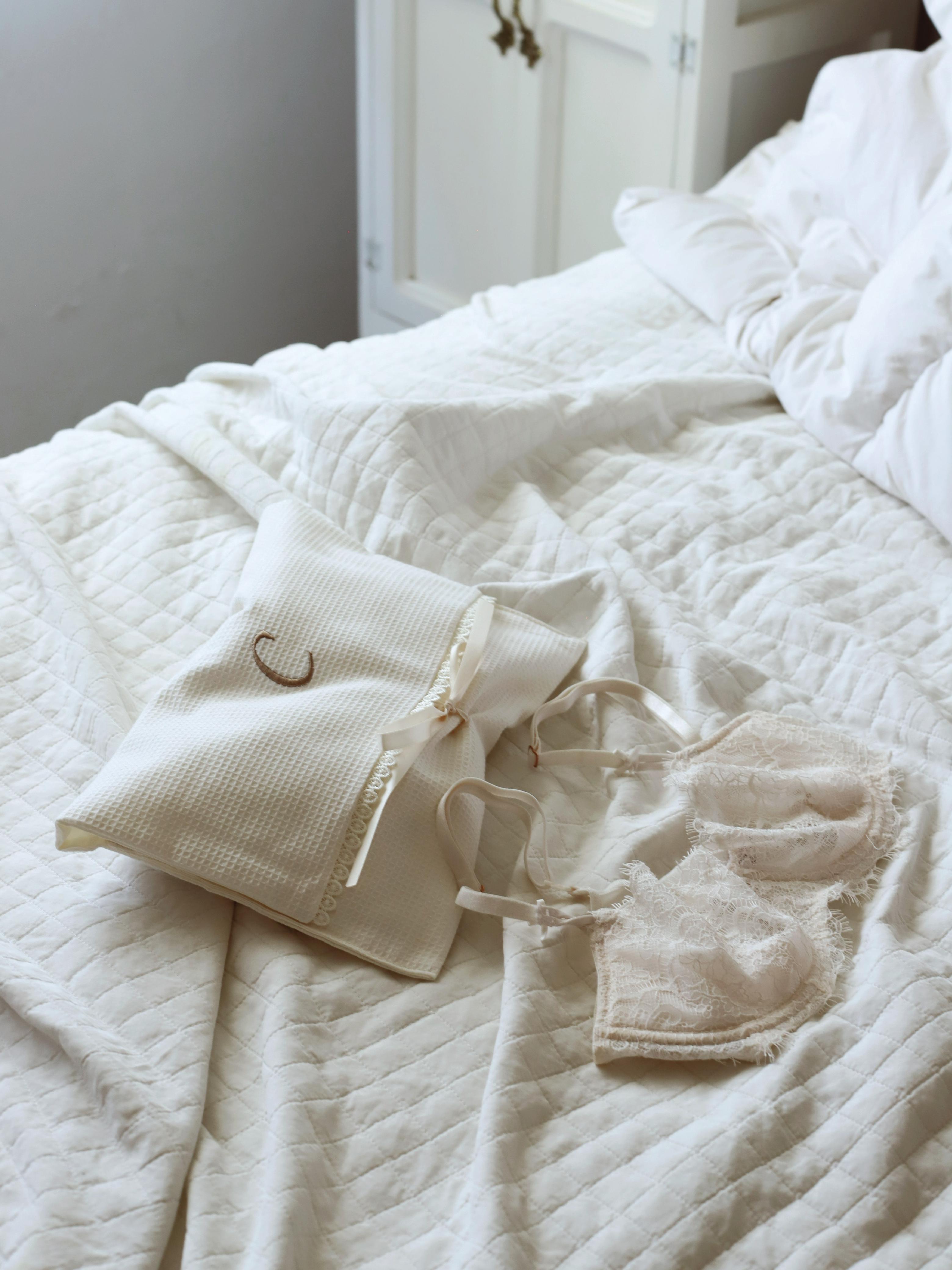 Algodon waffle, encajes y listones suaves.